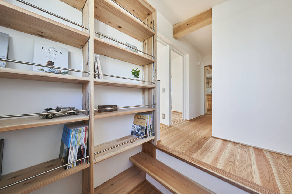 階段の踊り場にはご主人の趣味の本がたくさん収納出来るように壁一面に本棚を設けました。