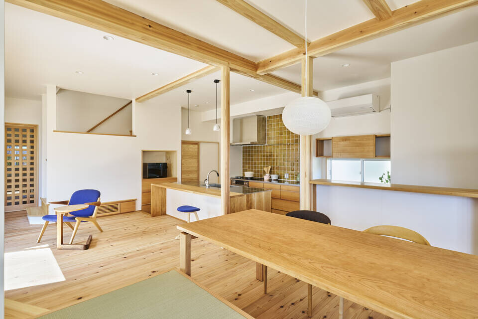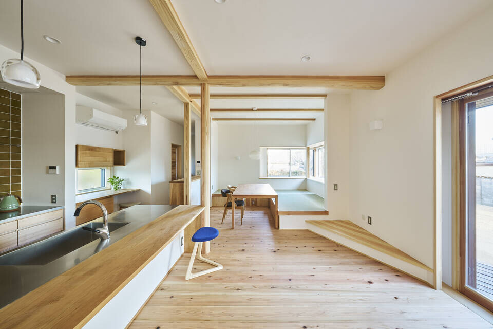 ダイニングは最も気持ち良い場所である南東に。食事という日々の中でも欠かせないかつ家族が集うシーンを一番大切にデザイン。出窓との組み合わせで敷地の魅力である南東の抜けと借景、陽当たりも存分に座っても、ごろんとしても気分に合わせて気持ち良く過ごせるよう一部畳敷きにしています。