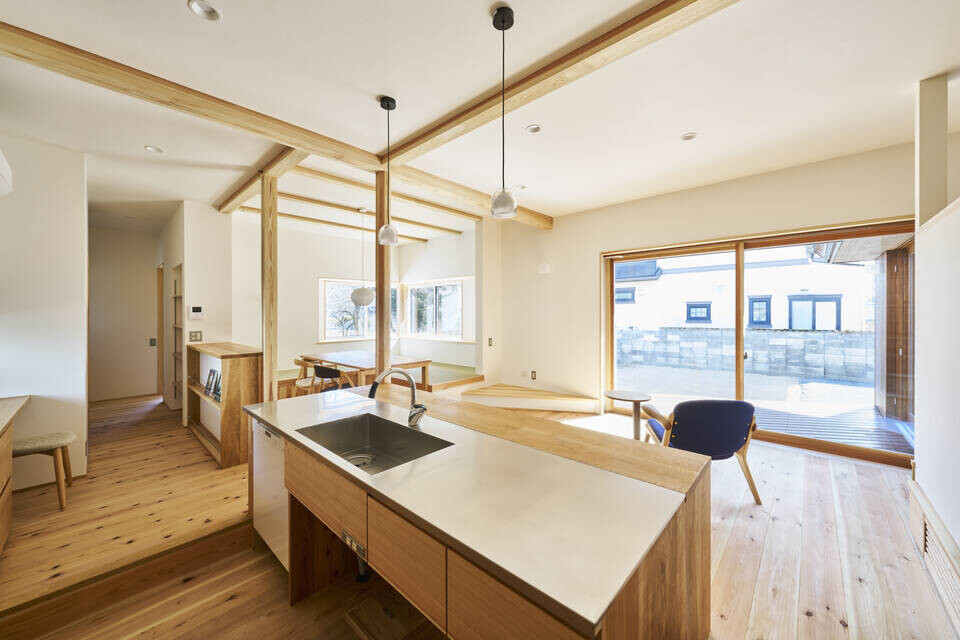 キッチンからはLDK全体が見渡せます。また、キッチンは一段堀り下げており目線が合って会話も弾みます。
