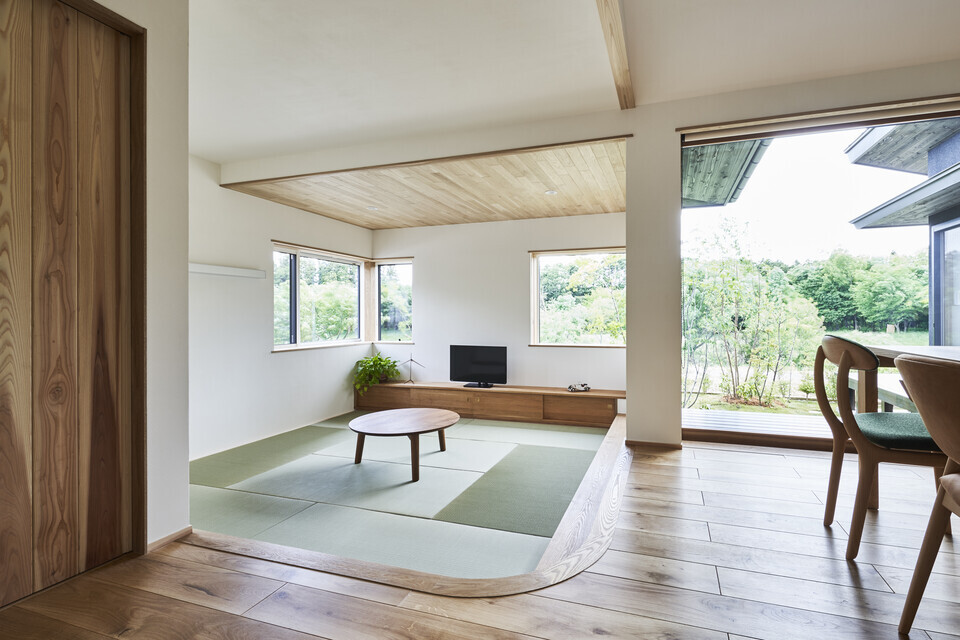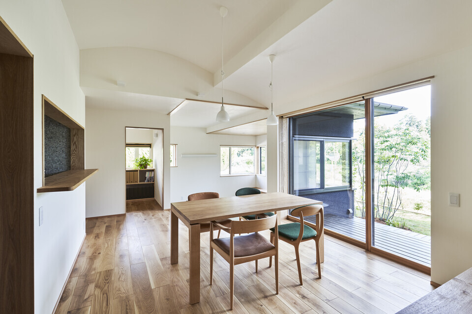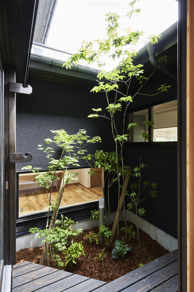 また、M様邸は浴室や寝室に面する部分に中庭を設け、窓からの景色を楽しめるように、そしてダイニングからは、緑地の借景を取れるよう大きな掃き出し窓に、緑が豊かな環境を活かした住まいとなっています。自然に溶け込むように家が存在していることが希望だったM様は、いたるところに植栽を取り入れました。植栽の剪定や芝生の管理は、自分の思い通りにいかないことも多いといいますが、それも含めて楽しんで生活していると話してくださいました。