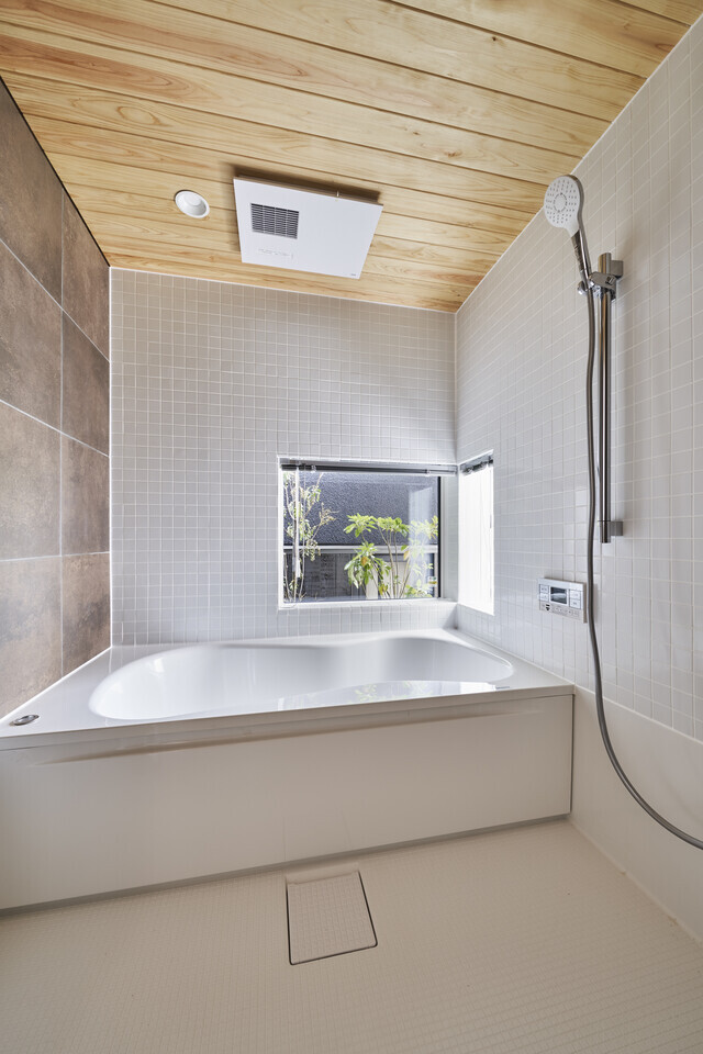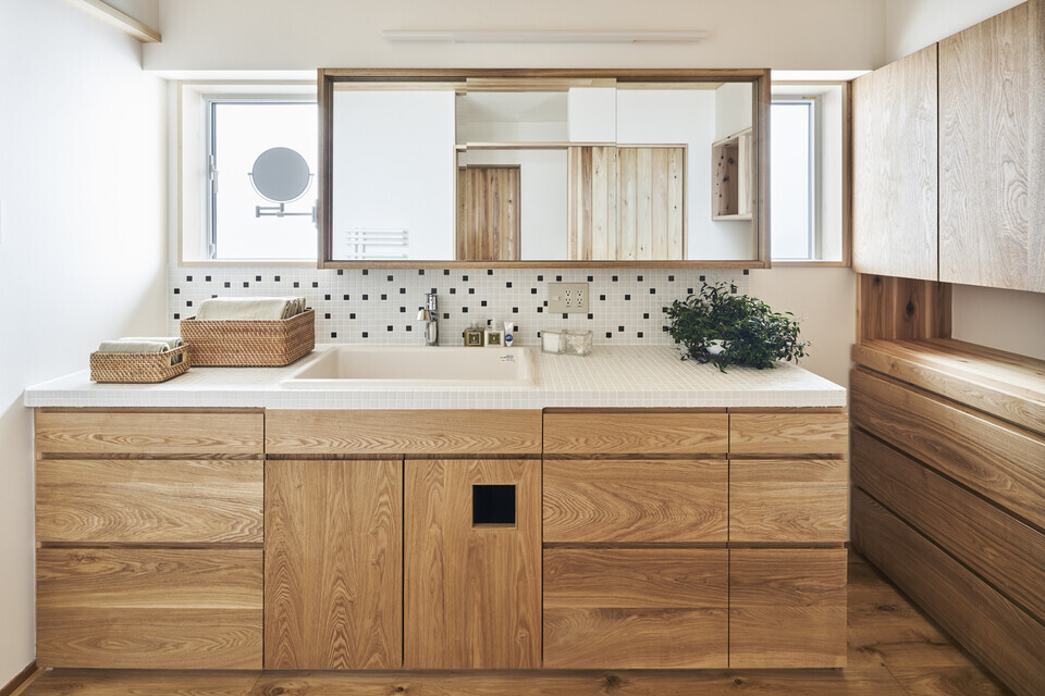 家づくりの中で参考になったのは、オーナー様邸の見学でした。実際に住んでいるオーナー様の話を参考に、洗面台には病院用の大きく深い洗面やタイルを採用しました。窓から光の入る明るい洗面台は、2種類の質感が異なる白いタイルに、紺色のタイルがシンプルな中にアクセントを加えています。オーナー様から、良かったこと、こうすればもっと使いやすかったといった体験談を自分たちの家に活かせたことは大きかったと話します。